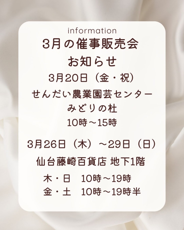 いつも当店をご利用いただき誠にありがとうございます。 10月23日(木)24日(金)は、2か月ぶりの藤崎での販売会です。 遠くて鈎取までは来れないお客様は、ぜひ藤崎へ足をお運びください。 皆さまのご来店を心よりお待ちして